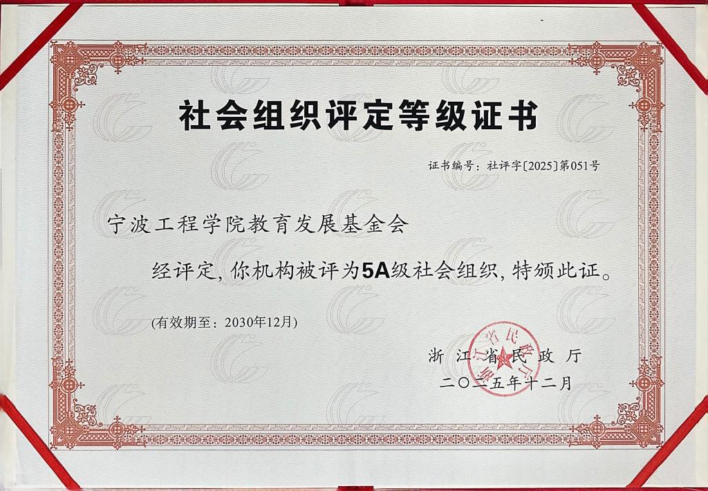 宁波工程学院教育发展基金会成立于2010年10月,是省民政厅登记注册、省教育厅主管的非公募慈善组织,秉持“汇聚社会爱心,助力教育发展”核心使命,搭建起学校与社会各界沟通合作的坚实桥梁。自2019年首获5A级以来,基金会以评促建、以评促优,持续完善治理体系,规范资金管理,优化公益项目运作,为学校教育事业发展提供重要支撑。